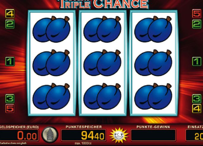 So kann der Spieler bei Triple Chance online seinen Einsatz selbst bestimmen und das ist auch ganz entscheidend: Drei Walzen drehen sich und ergeben bei Stillstand Kombinationen. Diese Kombinationen bestehen nun aus allerlei Früchten und je nach einzelner Wertigkeit bedeutet der sich ergebende Obstsalat den kleinen oder großen Gewinn. Über die sogenannten Gewinnlinien legt der Spieler fest, welche Symbole in welcher Weise eine Kombination eingehen könnenm. Anfänger, die sich noch nicht sonderlich auskennen, neigen zu hohen Einsätzen auf einzelne Linien, was sich jedoch in der Praxis der Profis als nicht zielführend erweist. Vielmehr sind wirklich alle fünf Gewinnlinien mit Einsätzen zu bespielen, gern kann das auch nur der obligatorische eine Cent sein! Denn je mehr Linien belegt sind, desto häufiger drehen sich die Walzen in die richtigen Positionen. Jeder sollte die eigene Kohle sorgsam verwalten und auf die richtige Chance lauern.